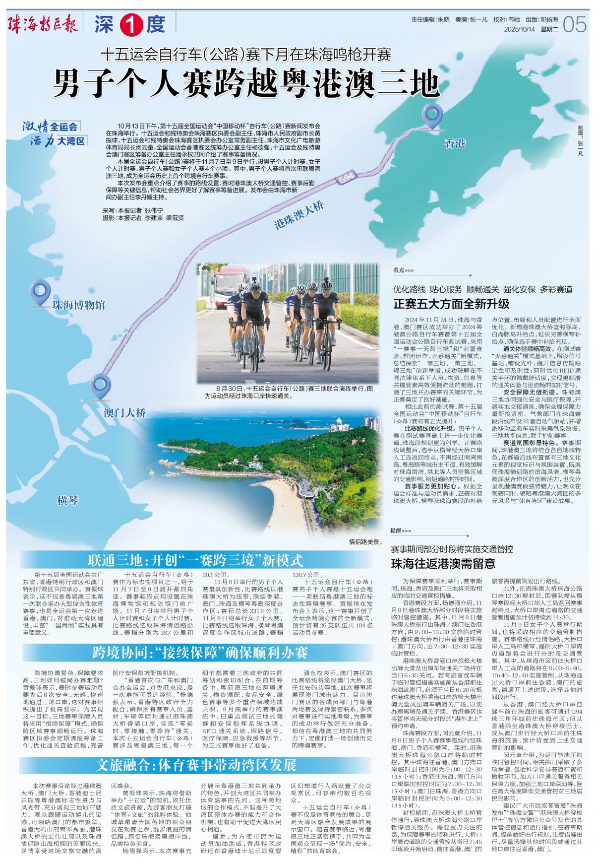 2024年11月24日,珠海与香港、澳门赛区成功举办了2024粤港澳公路自行车赛暨第十五届全国运动会公路自行车测试赛,采用“一赛事一天跨三境”和“前置查验、封闭运作、无感通关”新模式,总结探索“一事三地、一策三地、一规三地”创新举措,成功破解在不同法律体系下人员、物资、信息等关键要素高效便捷流动的难题,打通了三地共办赛事的关键环节,为正赛奠定了良好基础。