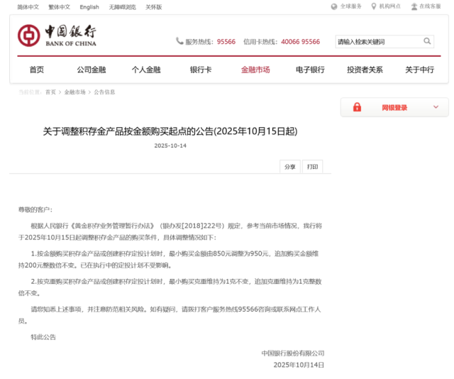 中国银行发布关于调整积存金产品按金额购买起点的公告。将于2025年10月15日起调整积存金产品的购买条件,具体调整情况如下:1.按金额购买积存金产品或创建积存定投计划时,最小购买金额由850元调整为950元,追加购买金额维持200元整数倍不变。已在执行中的定投计划不受影响。2.按克重购买积存金产品或创建积存定投计划时,最小购买克重维持为1克不变,追加克重维持为1克整数倍不变。