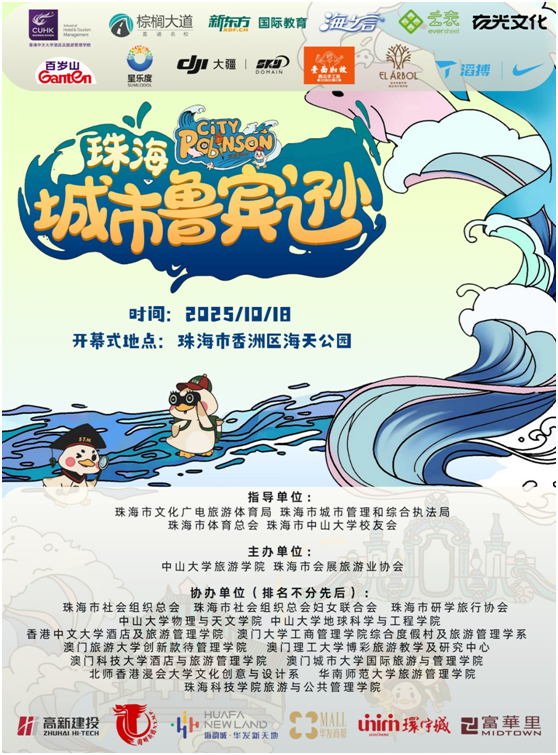 赛事由中山大学旅游学院与珠海市会展旅游业协会联合主办,并获珠海市文化广电旅游体育局、珠海市体育总会等多个单位指导支持。同时,香港中文大学、澳门大学、澳门旅游大学、华南师范大学等十所粤港澳高校院系共同协办,积极响应“全民健身”国家战略,助力全运氛围营造。
