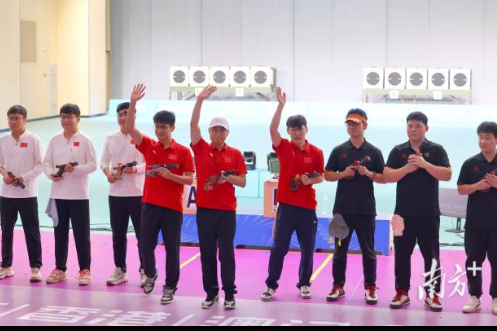 10月15日,十五运会射击(步手枪)比赛迎来第四个比赛日。在当天上午率先举行的男子10米气步枪团体决赛中,由巴黎奥运会冠军刘宇坤领衔的陕西队和队友李牧原、刘一鸣共同出战。经过激烈角逐,陕西队以17比9战胜浙江队,夺得金牌。
