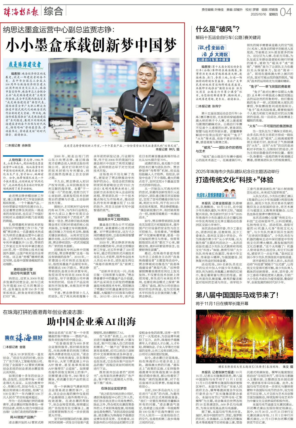 最近,在珠海市委宣传部与市总工会联合主办的“我是珠海建设者”主题宣传活动中,贾志铮被成功推选为“我是珠海建设者”典型代表。“这种荣誉鼓舞着我继续在岗位上发光发热,不仅要在技术创新上持续突破,率先进行未来技术布局,也要在商业模式上探索‘第二增长’曲线,既为公司创造出较好的经济效益,也为实现高水平科技自立自强贡献力量。”贾志铮说。