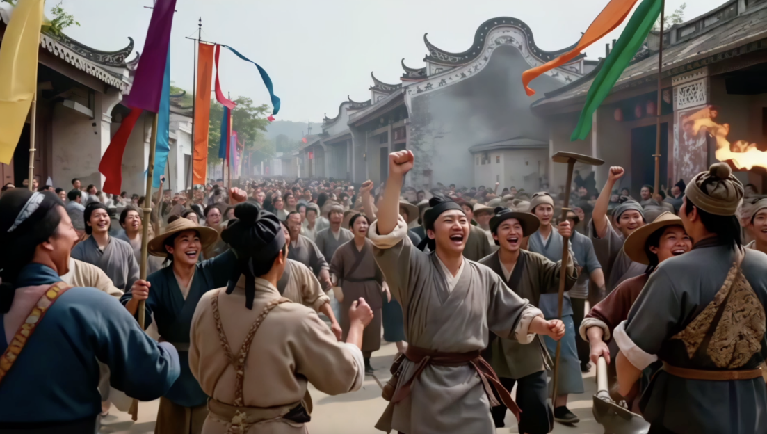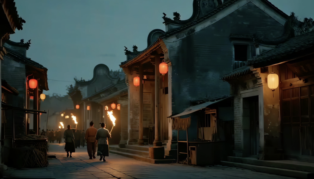 为了讲好这段六百年的秋色故事,我们决定借科技之力,让历史可感可视——明代乡民剪锦为旗、削竹为戈,夜晚灯火通明、敲盆为阵,吓退黄萧养;汾江古渡千帆交错,商船如织,铺陈出“天下四大聚”的繁华……于是,当AI生成的画面与今日巡游的盛景交叠,我们仿佛打开了一扇时空之门,让观众亲眼看见:一种民俗,如何从一场生存的智慧,演变为一座城的集体记忆。