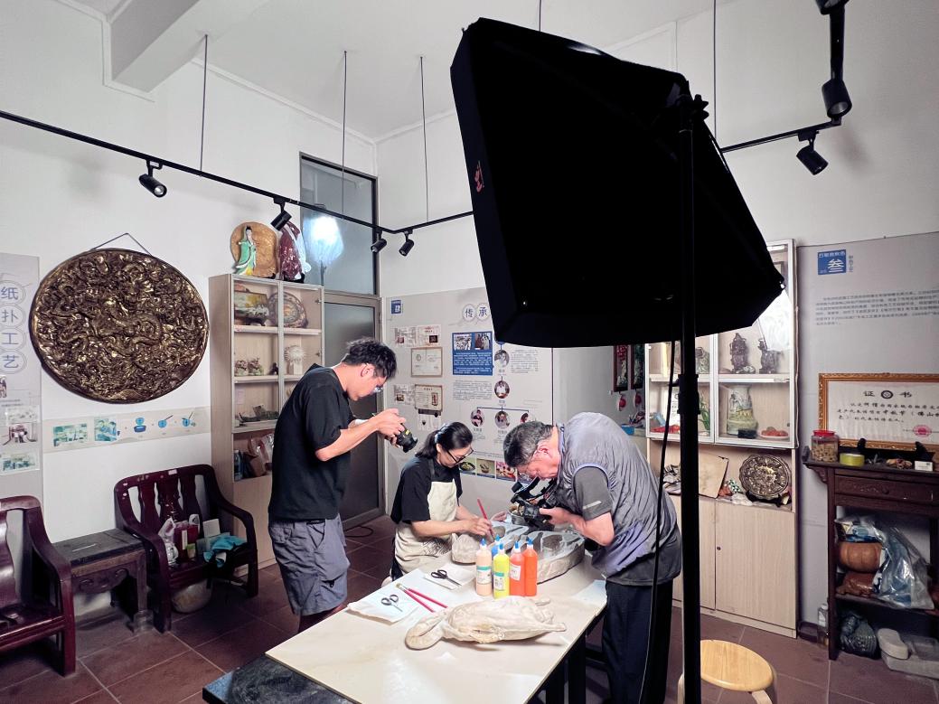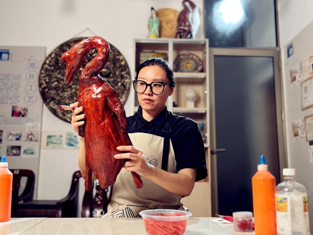 随后,将宣纸蘸上浆糊,覆上新的一层。如此工序,反复二十多层。待纸朴层彻底干透后精准着色上油,一只色泽金黄、油脂欲坠的“烧鹅”,要历经二十多天的精心“烹制”,完美“出炉”。