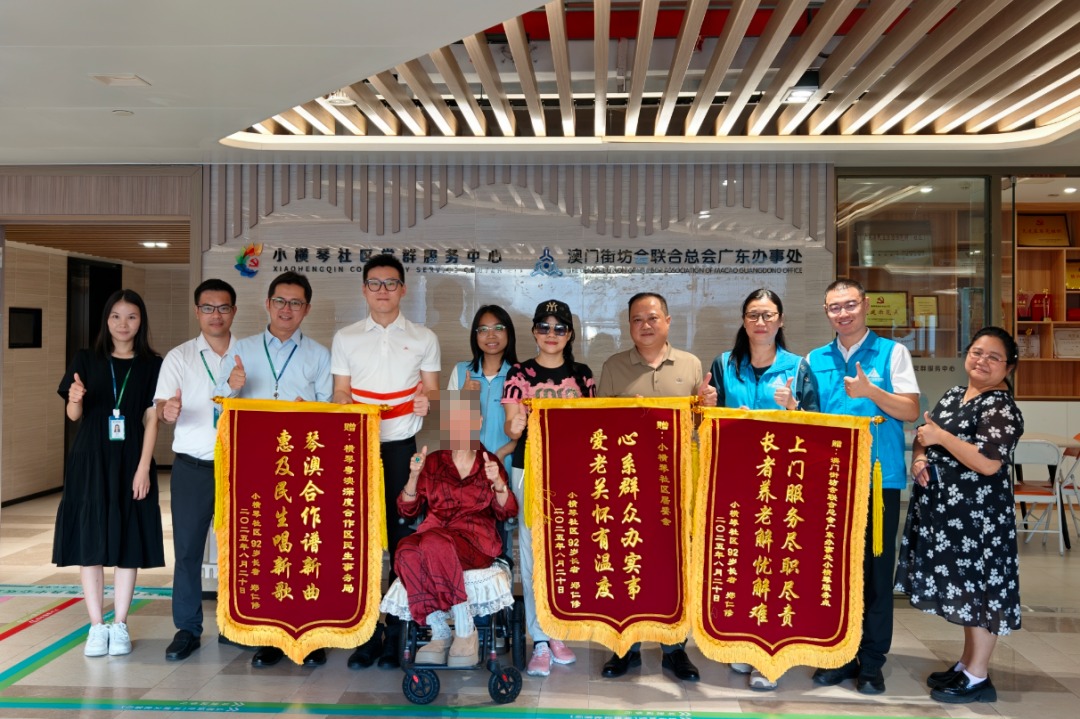 10月13日下午,居住在横琴粤澳深度合作区(下称合作区)小横琴社区的90岁高龄长者郑仁修及其家属,将印有“心系群众办实事,爱老关怀有温度”的锦旗,送到小横琴社区党委书记、居委会主任陈景锋手中。锦旗上“心系群众办实事,爱老关怀有温度”的金色大字,不仅是对各方倾力服务的诚挚谢意,更是对小横琴社区惠及长者民生工作的生动写照。