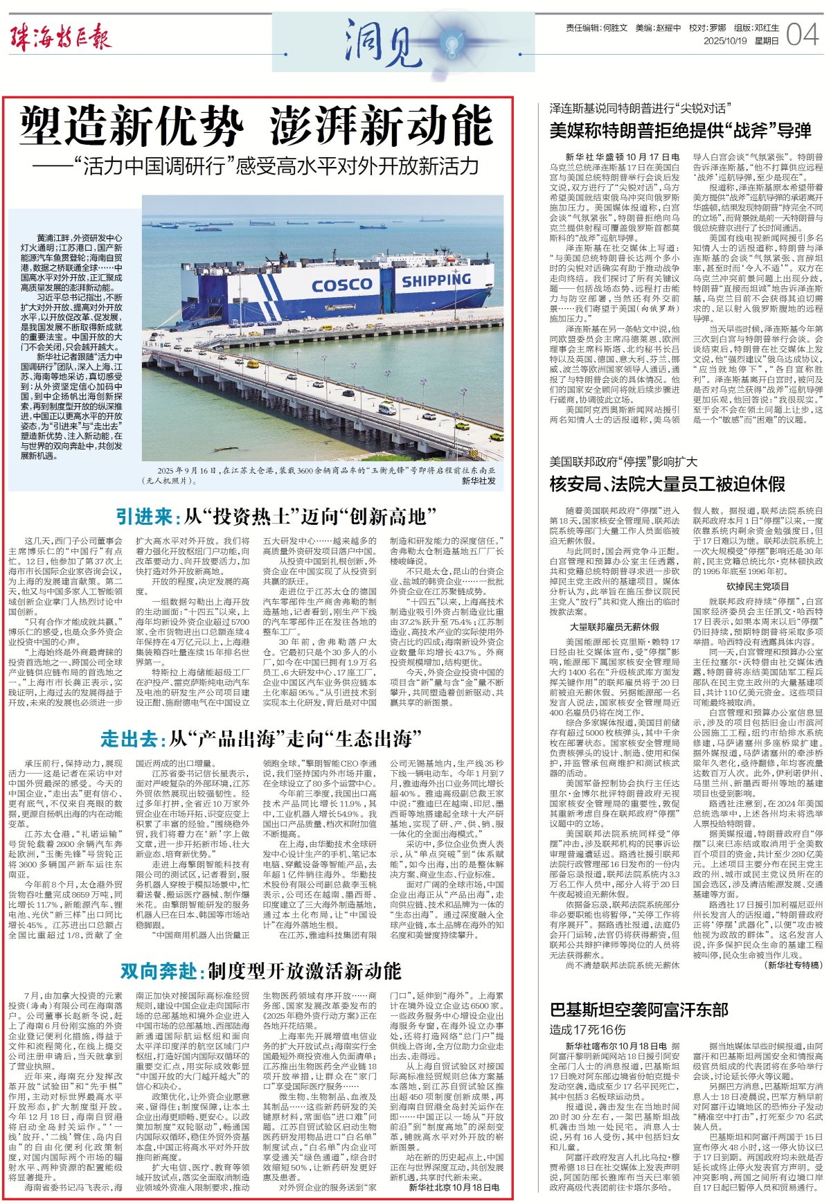 新华社记者跟随“活力中国调研行”团队,深入上海、江苏、海南等地采访,真切感受到:从外资坚定信心加码中国,到中企扬帆出海创新探索,再到制度型开放的纵深推进,中国正以更高水平的开放姿态,为“引进来”与“走出去”塑造新优势、注入新动能,在与世界的双向奔赴中,共创发展新机遇。