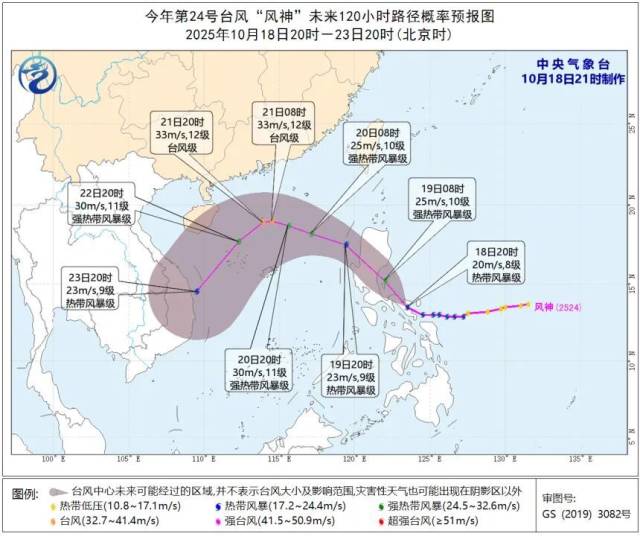 受“风神”和冷空气共同影响,19-22日,南海北部和广东省沿海海域风力将自东向西逐渐加大到7—9级、阵风10级,台风中心经过的附近海域风力11—12级、阵风13级。
