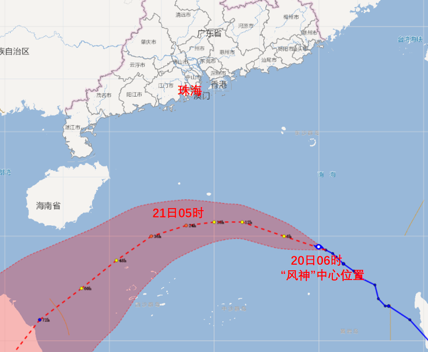珠海市气象局10月20日6时10分发布,昨夜至今“风神”稳定向西偏北方向移动,6时中心位于我市东南方约620公里的海面上(北纬17.7度、东经117.0度),中心附近最大风力9级(热带风暴级,23米/秒),中心最低气压990百帕。预计“风神”将以20-25公里的时速继续向西偏北方向移动,强度逐渐增强。