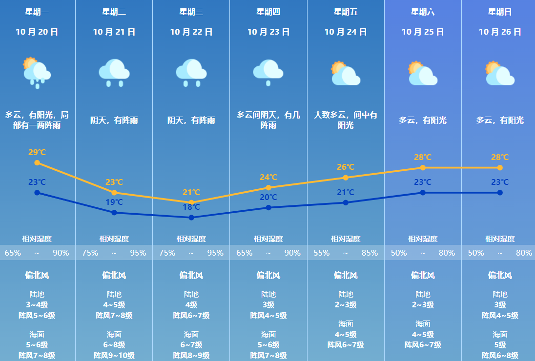 温馨提示:未来几天我市海面风力加大,需注意防范海上大风;同时天气渐转清凉,请注意及时增添衣物。