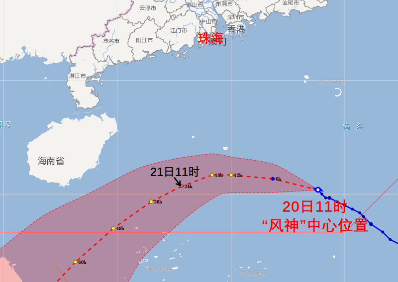 珠海市气象台10月20日11时55分发布,20日11时“风神”(热带风暴级,9级)中心位于我市东南方约550公里的南海海面上,预计其将继续向西偏北方向移动,强度逐渐增强,21日白天开始在南海中北部海面转向西南方向移动,趋向越南中部沿海。受冷空气和“风神”共同影响,目前我市沿岸及海面风力已加大至阵风7-8级,预计21-22日我市气温下降,并伴有阵雨,天气清凉,沿岸及海面风力6-8级阵风8-10级。