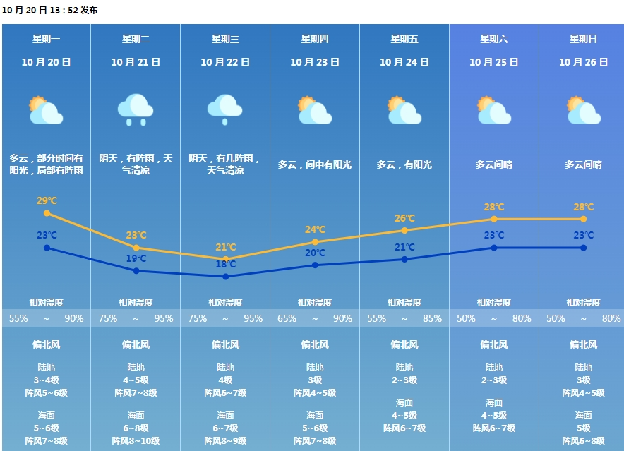 温馨提示:未来几天我市海面风力加大,需注意防范海上大风;同时天气转凉,请注意及时增添衣物。