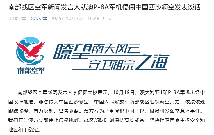 南部战区空军新闻发言人李健健大校表示,10月19日,澳大利亚1架P-8A军机未经中国政府批准,非法侵入中国西沙领空,中国人民解放军南部战区组织海空兵力,依法依规跟踪监视、有力反制、警告驱离。澳方行为严重侵犯中国主权,极易引发海空意外事件。我们正告澳方立即停止侵权挑衅。战区部队时刻保持高度戒备,坚决捍卫国家主权安全和地区和平稳定。