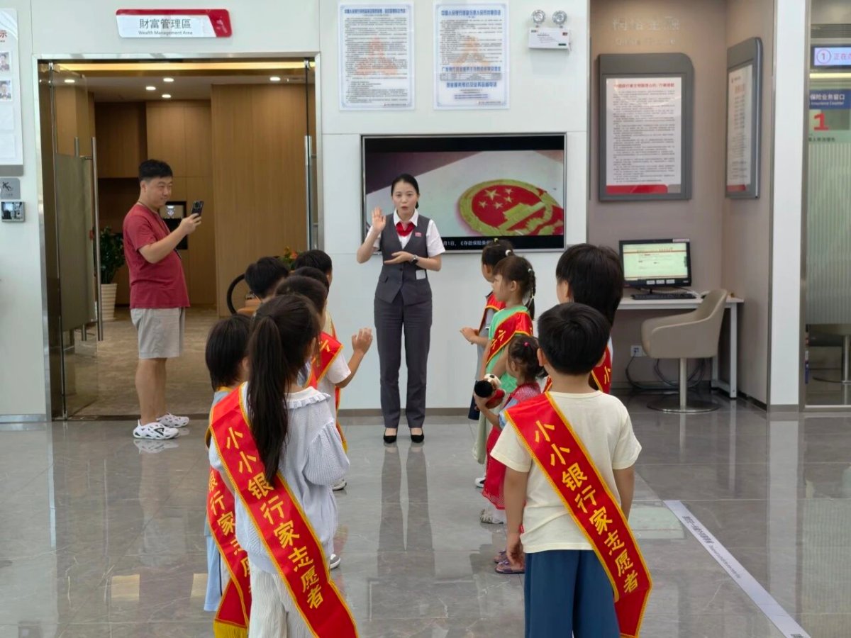 活动刚开场,广发银行工作人员就为孩子们戴上了定制的“小小银行家”绶带。系上绶带后,孩子们下意识挺直小身板,瞬间有了“职场小新人”的模样。随后,大家围在银行晨会区域,全程模仿职员晨会流程——跟着工作人员站成整齐队伍,认真倾听当日“小任务”讲解;当听到“用微笑服务每一位客户”的提示时,孩子们齐声回应“收到!”,稚嫩却响亮的声音让现场充满童趣。
