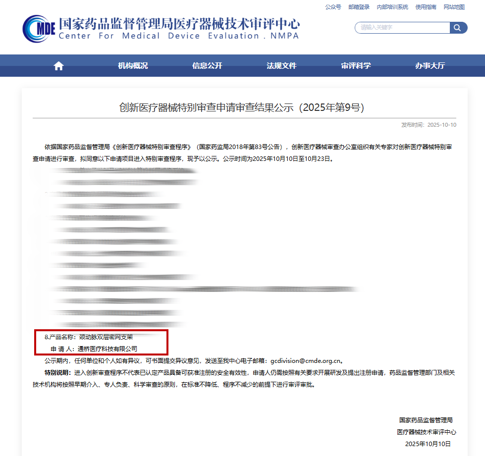 根据NMPA近日公示的第九批创新医疗器械特别审查申请审查结果,全国共有8款来自心血管、影像、眼科等领域的创新产品入选。通桥医疗的“颈动脉双层密网支架”凭借其独特的设计和卓越的技术优势脱颖而出,成为本批次中引人注目的国产创新器械之一。
