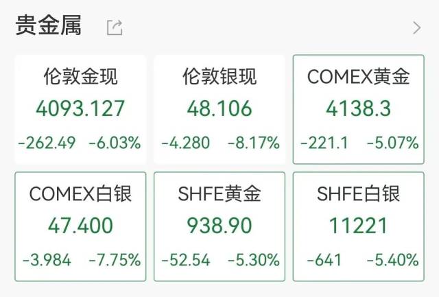 10月21日晚间,现货黄金持续跳水,截至22:47,现货黄金日内跌幅扩大超6%,报4093.127美元/盎司,创四年来最大跌幅。现货白银跌8.17%,报48.106美元/盎司。