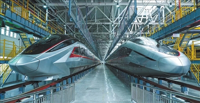 试验中,CR450动车组从静止加速至时速350公里,仅需4分40秒,比CR400动车组快100秒。中国铁道科学研究院首席研究员赵红卫介绍,CR450动车组采用的永磁牵引系统比CR400动车组效率提升4%,动力更强。同时,CR450动车组对转向架区域进行了全包覆,裙板变得更低,露出来的轮子更少;动车组的车高降低200毫米,车头延长到15米,并对车端连接进行了优化调整,相较CR400动车组,CR450动车组整车阻力减小22%。