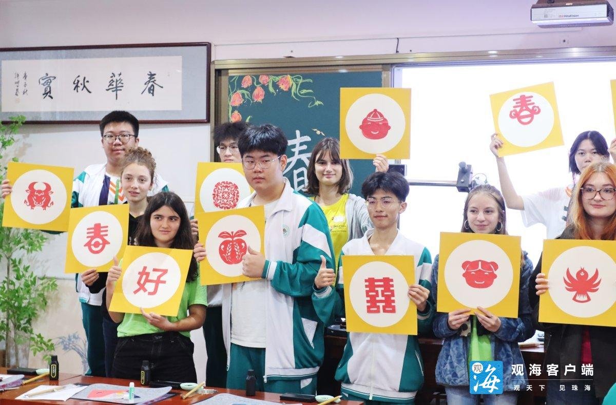在相互熟络之后,中法双方学生共同参加了法语互动课堂以及汉语文化课堂。课堂上,中方学生和法方学生结成对子,互相帮助。“她帮助我锻炼了法语,我教了她书法的运笔。”珠海市广东实验中学金湾学校学生卢泓瑞说。“这次设置的汉语文化课堂,我们选择教‘春’字,还准备了春节会用到的红色剪纸,希望让法国师生通过汉字独特的结构美感,直观地感受到中国文化里的独特审美与深厚意境。”珠海市广东实验中学金湾学校副校长黄堡鑫告诉记者。