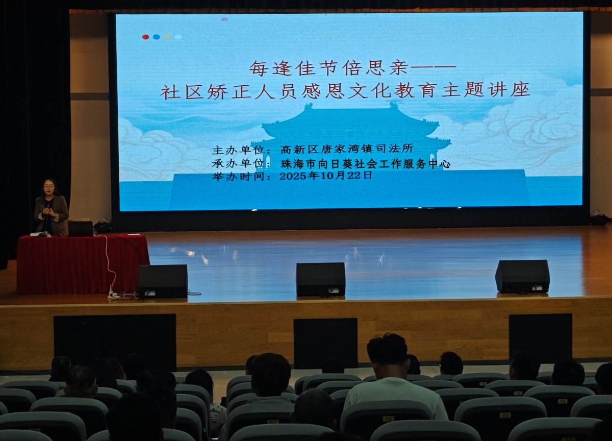 10月22日,在重阳节来临之际,为弘扬中华优秀传统文化,深化社区矫正对象思想道德教育,珠海高新区唐家湾镇司法所携手珠海市向日葵社会工作服务中心举办了“重阳话感恩,温情助回归”感恩文化教育专题讲座。活动通过文化浸润与情感引导,助力社区矫正对象增强家庭责任感与社会归属感,为其顺利回归社会注入温暖力量。