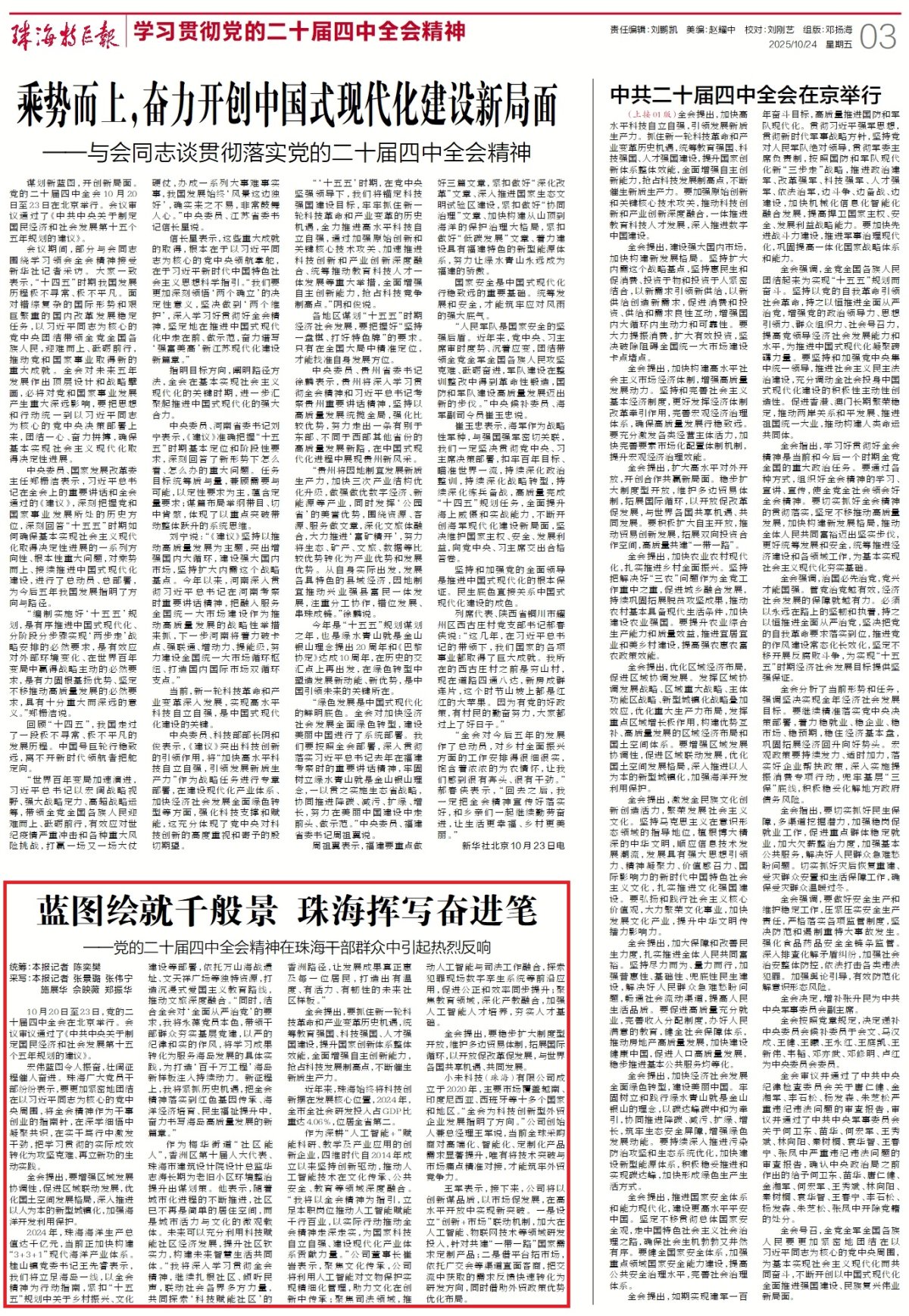 宏伟蓝图令人振奋,壮阔征程催人奋进。珠海广大党员干部纷纷表示,要更加紧密地团结在以习近平同志为核心的党中央周围,将全会精神作为干事创业的指南针,在深学细悟中凝聚共识,在实干笃行中激发干劲,把学习贯彻的实际成效转化为攻坚克难、再立新功的生动实践。