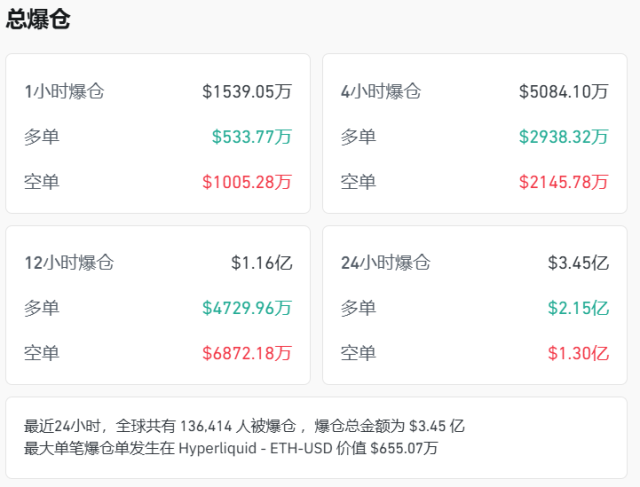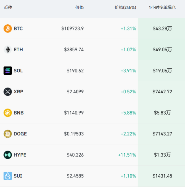 加密货币方面,多个币种大涨,截至23:00,比特币徘徊在11万美元关口,以太坊报3859美元,均涨超1%,BNB涨超5%,过去24小时,加密货币全网超13万人被爆仓。