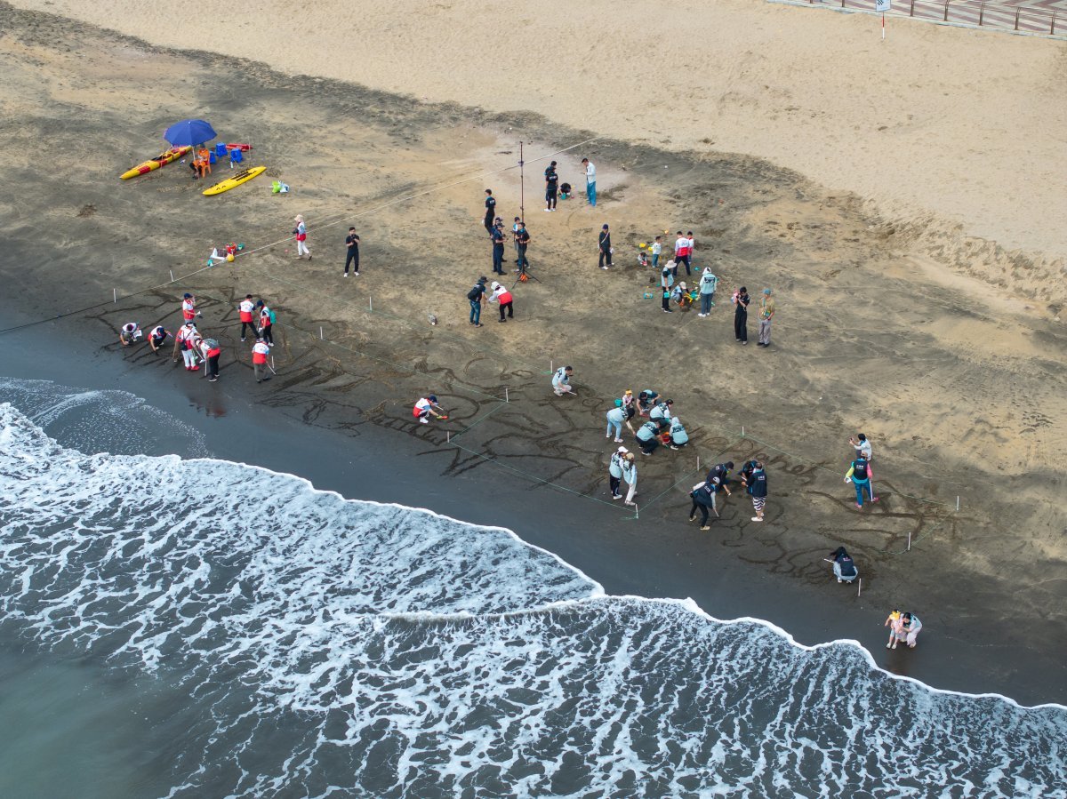 活动通过沙艺共创、环保宣传与全运推广等多元形式,深化珠澳志愿服务协同发展,推动两地志愿者在环保宣传与大型赛事推广方面的交流合作。在“沙艺共创”环节中,两地志愿者以沙滩为画布,携手创作融合海洋保护理念与湾区人文特色的巨型画作,通过艺术传递环保理念。