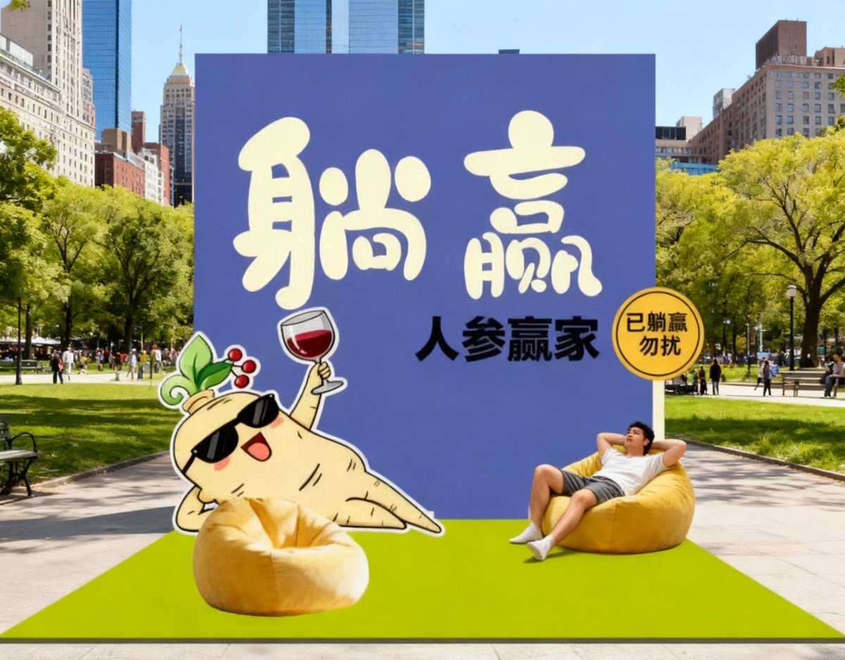为配合宣传人参文化,集市设置了众多大型美陈打卡点,增加游玩互动体验,一起笑看狂野“人参”,玩转躺赢“人参”。