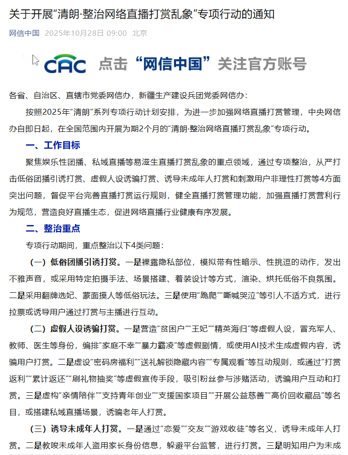 按照2025年“清朗”系列专项行动计划安排,为进一步加强网络直播打赏管理,中央网信办自即日起,在全国范围内开展为期2个月的“清朗·整治网络直播打赏乱象”专项行动。