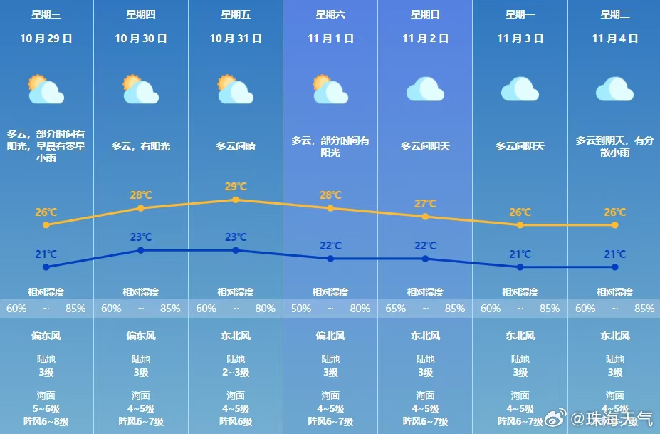 珠海七天天气预报:预计未来几天珠海市多云为主,偶有零星小雨,气温逐日回升;周末至下周初受弱冷空气影响,气温小幅下降。近期少雨干燥,注意用火用电安全;29-30日海面风力较大,注意海上交通安全。