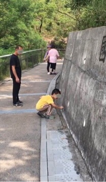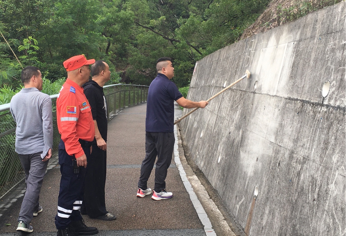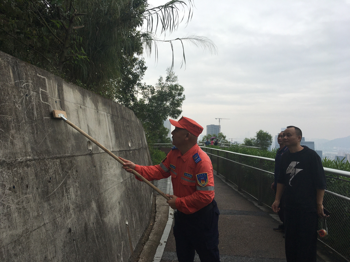 10月29日上午,上述栈道设施管理企业工作人员,联合珠海应急救援万众益心支队志愿者,对挡土墙所在区域进行集中清洁,基本恢复墙面原有状态。