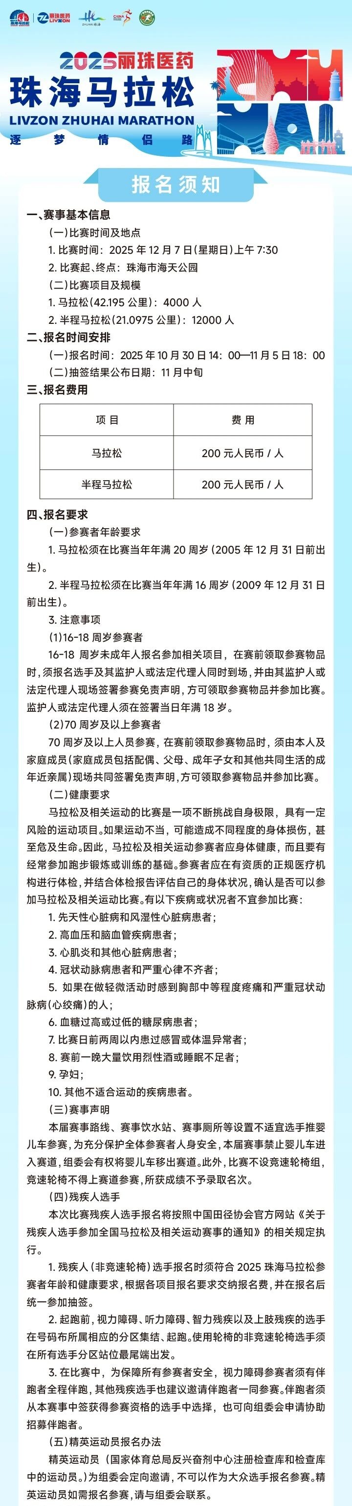 10月30日,华发体育公众号官宣,2025丽珠医药珠海马拉松将于12月7日鸣枪起跑,赛事分马拉松和半程马拉松两个项目,总规模16000人。