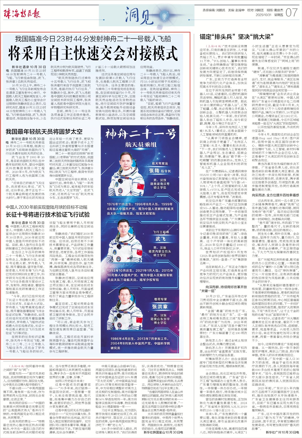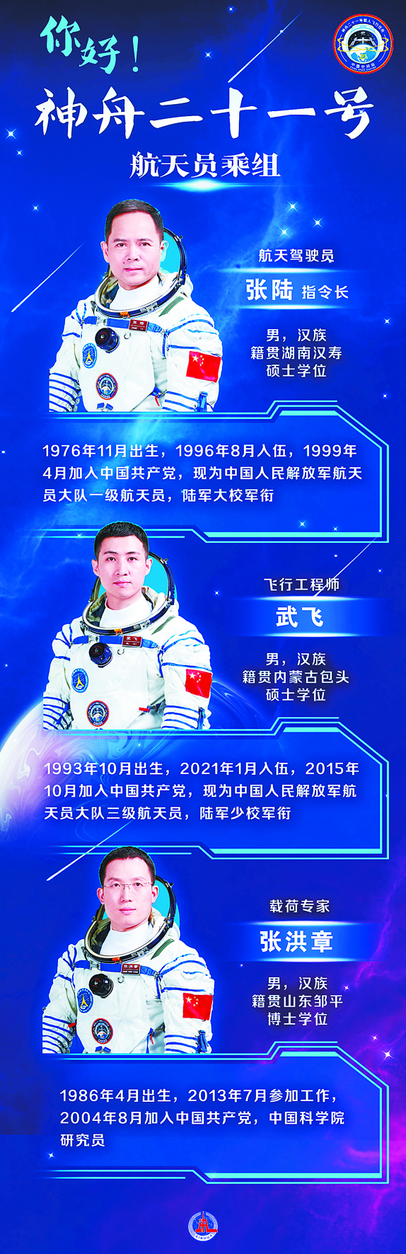 我国瞄准10月31日23时44分发射神舟二十一号载人飞船,飞行乘组由张陆、武飞、张洪章3名航天员组成。