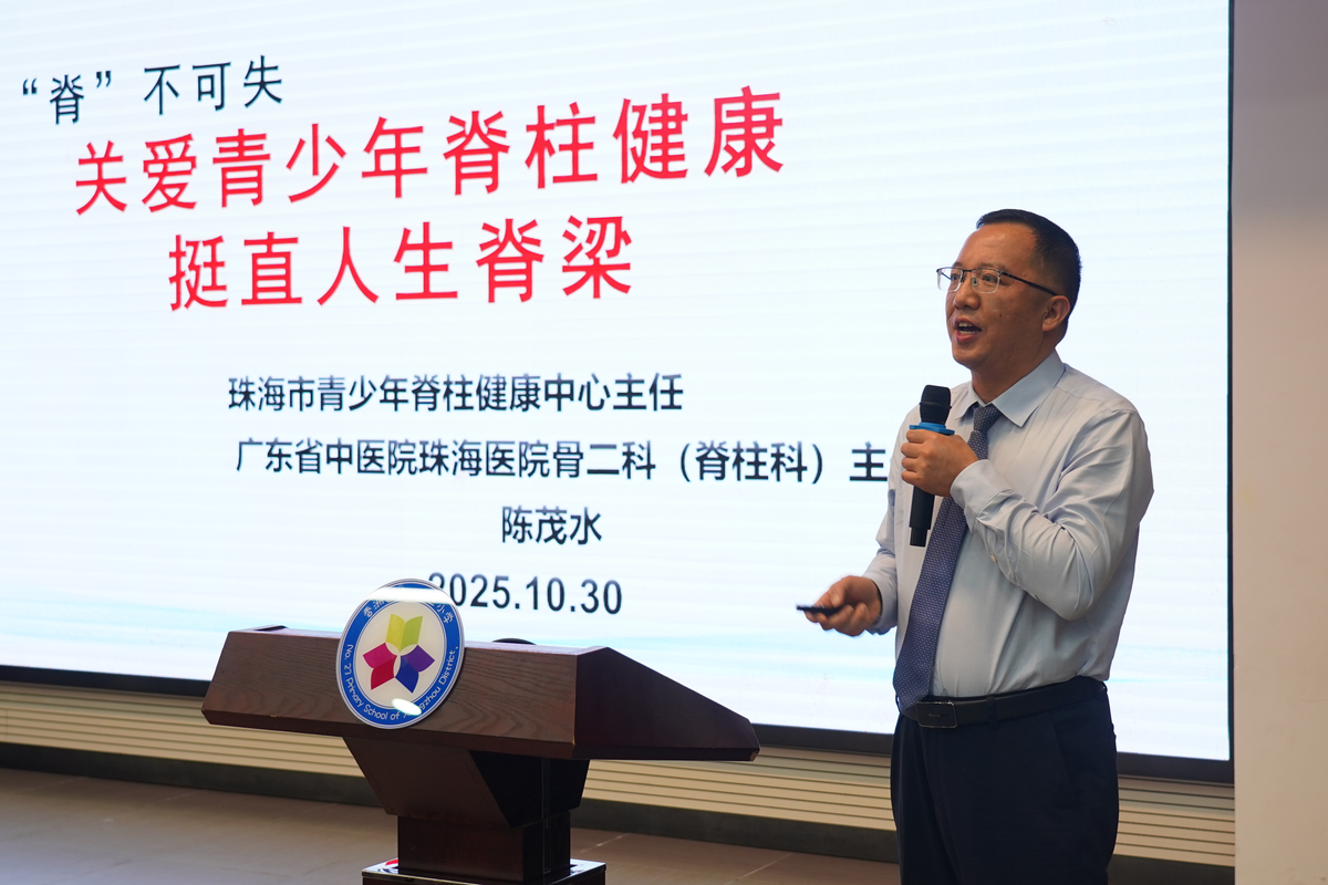 活动特邀珠海市健康科普专家、广东省中医院珠海医院骨二科(脊柱科)主任陈茂水医生担任主讲人。陈医生围绕脊柱侧弯与不良姿态的诱因、危害及科学矫正与防护措施三大核心,为师生带来了一场生动的脊柱健康科普课。
