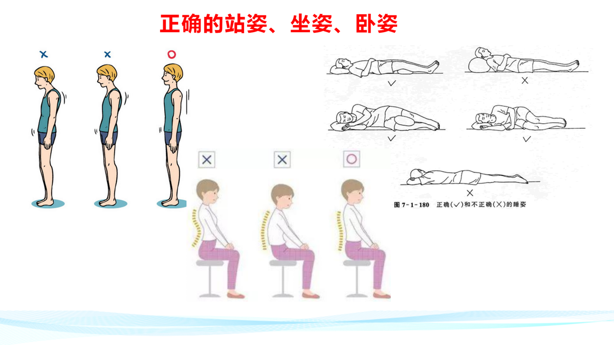 4、科学睡眠:选择合适硬度的床垫,枕头高度适中,仰卧和侧卧(膝盖间垫枕头)是较好睡姿。避免趴睡。