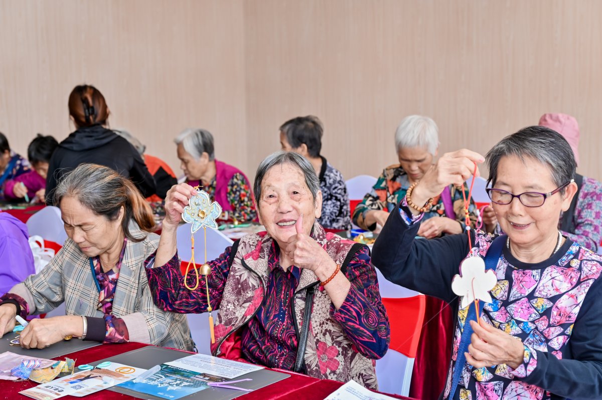 宋锦风铃非遗手工DIY是现场最热闹的环节。非遗老师与志愿者一对一指导,长者们穿线、刺绣、组装,普通材料在巧手下变成兼具文化韵味与纪念意义的风铃。“学会新手艺,还能把重阳祝福带回家!”参与活动的李阿姨拿着作品,笑容满面。