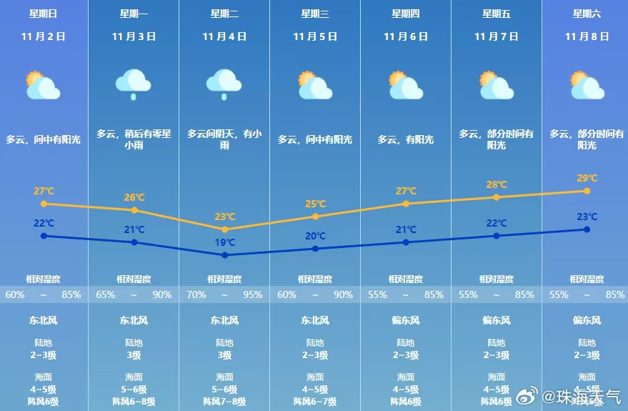 珠海七天天气预报:预计周日珠海市多云,间中有阳光;下周前期受弱冷空气影响,云量增多,间中有小雨,海面风力加大,体感清凉;展望下周中后期天色转好,气温回升。近期天气干燥,请注意森林防火和家居用火用电安全;3-4日海面风力较大,注意海上交通安全。