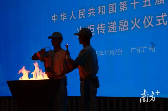 11月2日下午5点,第十五届全国运动会火炬传递融火仪式在广东奥林匹克体育中心省执委会办公楼一楼大堂举行。