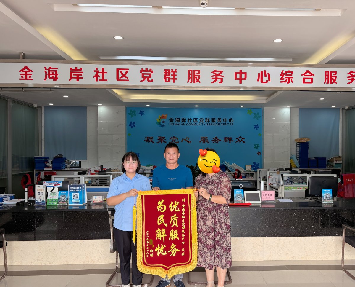 近日,居民林女士手捧一面锦旗郑重交到珠海市金湾区三灶镇金海岸社区党群服务中心政务工作人员成果的手中,锦旗上“优质服务,为民解忧”八个大字熠熠生辉,饱含着她的感激之情。