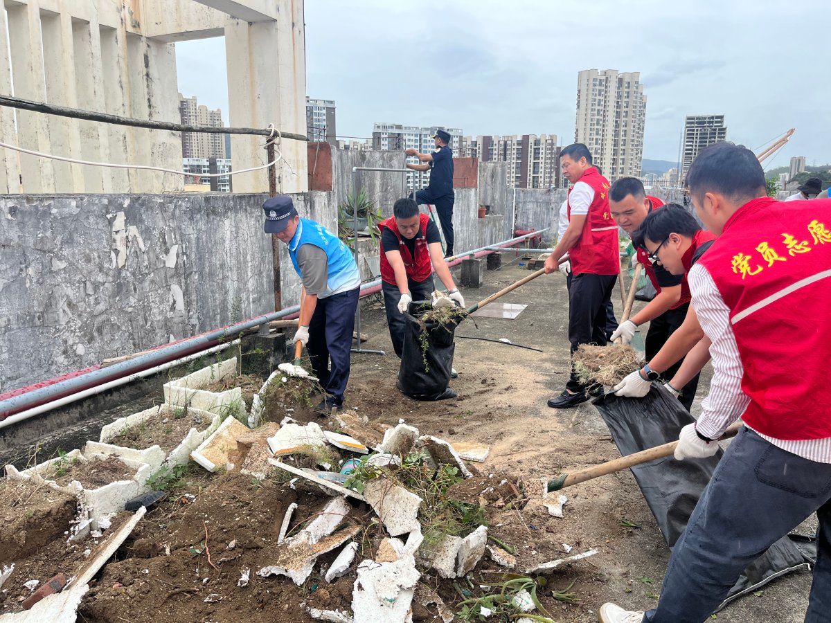 在推进十五运会专项保障的同时,三灶镇持续推进常态化蚊媒防控工作。全镇联合区、镇两级力量,发动党员、志愿者深入老旧小区、农贸市场等重点区域,开展“翻盆倒罐”环境清理行动,对闲置容器、楼顶天台等蚊虫孳生点进行地毯式排查。针对难以清理的区域,出动高空作业车、钩机等设备进行彻底整治。