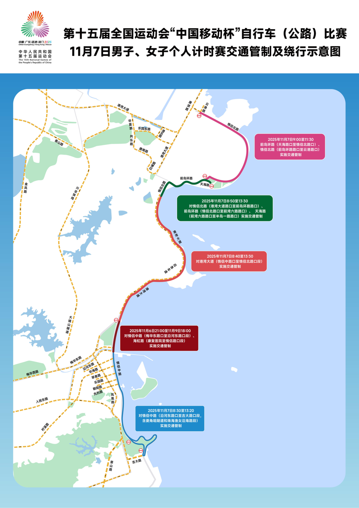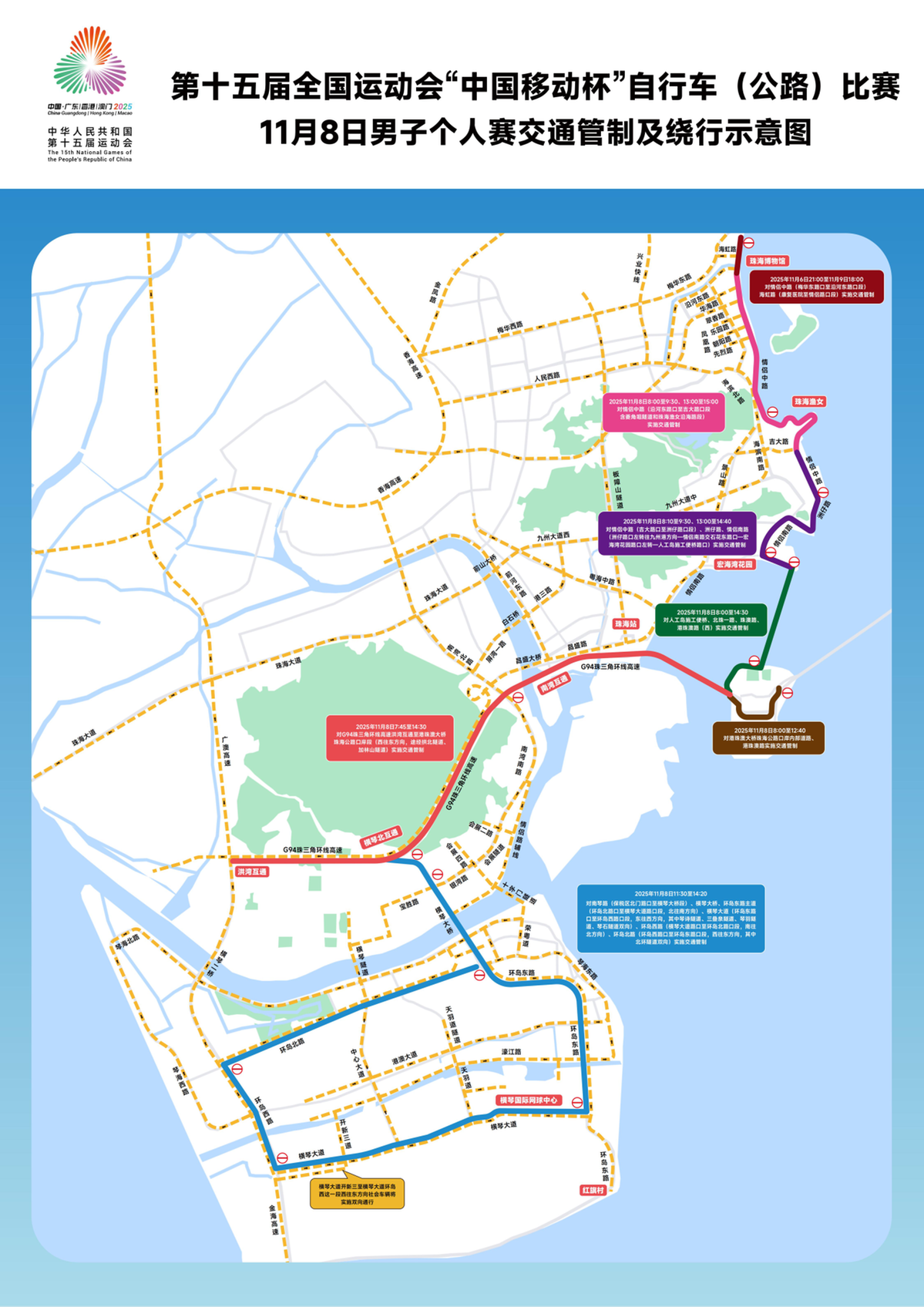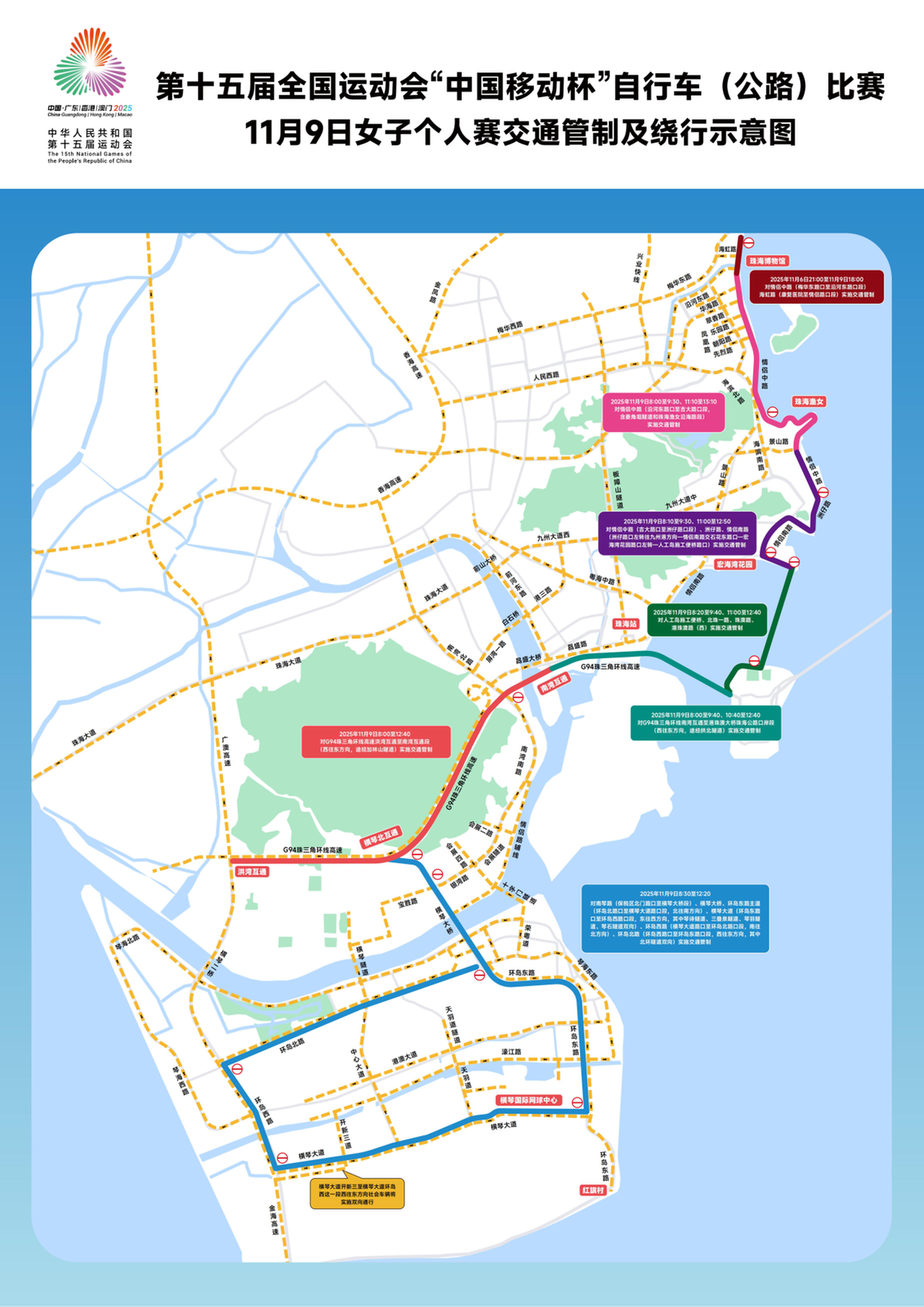 在赛事起终点区域,11月6日21:00至11月9日18:00期间,情侣中路(梅华东路口至沿河东路口段)、海虹路(康复医院至情侣路口段)将实施交通管制;11月7日举行男/女子个人计时赛当天,8:30至13:20时段内,情侣中路(沿河东路口至吉大路口段,含菱角咀隧道和珠海渔女沿海路段)实施交通管制,该路段因串联城市标志性景观,是赛事展示珠海风貌的重要节点。