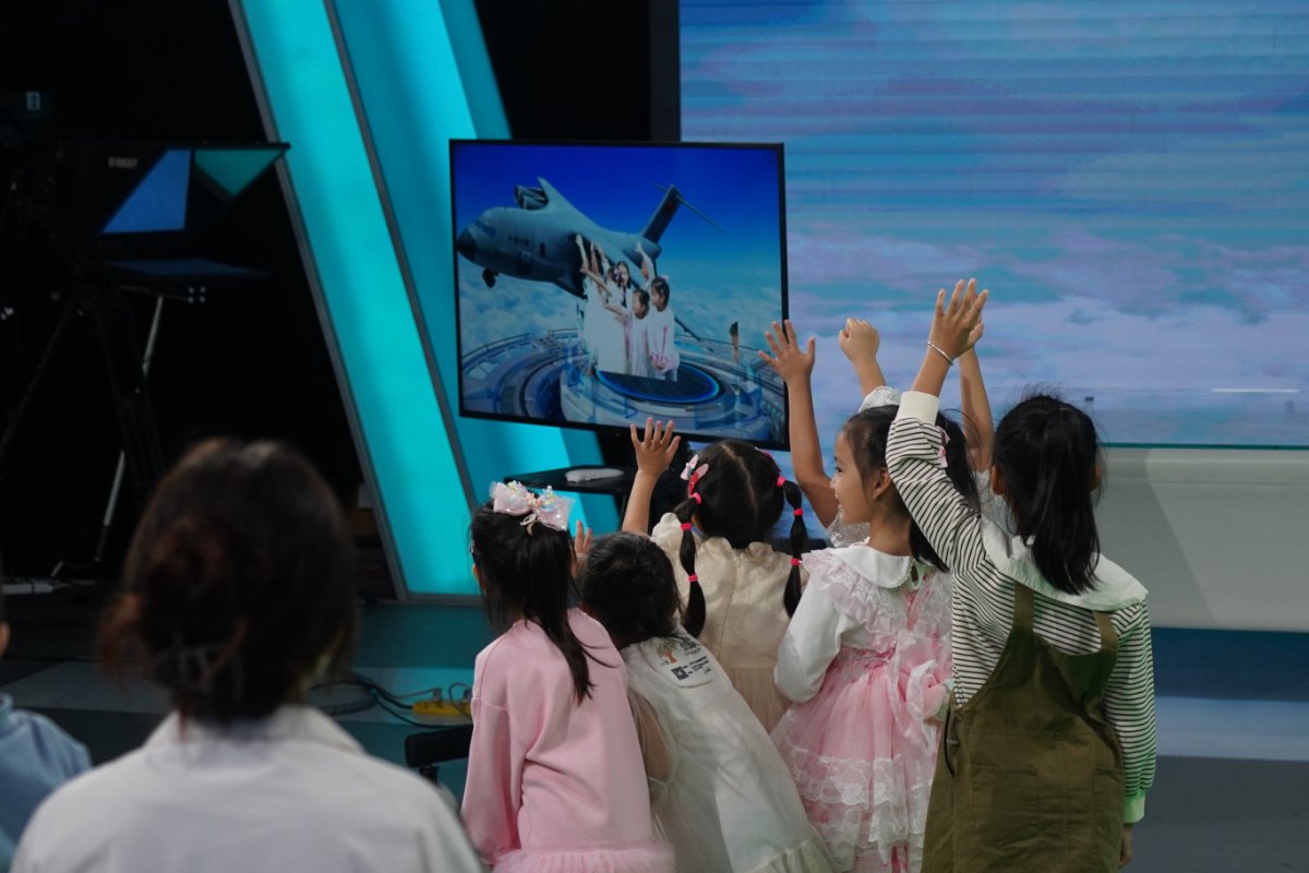 新闻直播间里,借助AR技术,孩子们仿佛瞬间“穿越”时空。虚拟演播技术带来的震撼体验,让抽象的技术概念化为可感可知的奇妙场景。