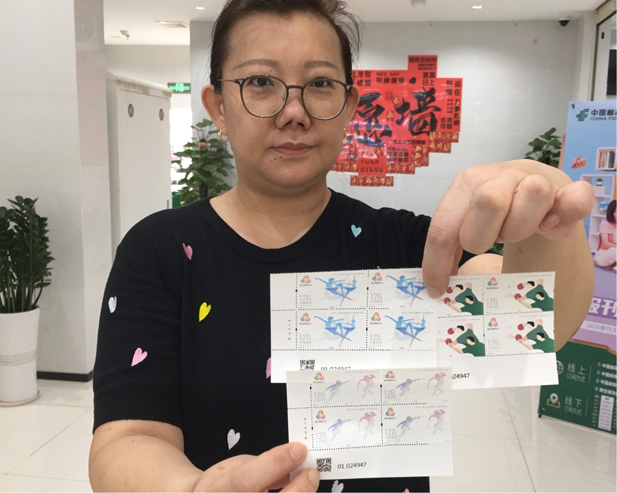 市民张女士给上高中的儿子集邮,鼓励孩子学习全运会健儿的拼搏精神