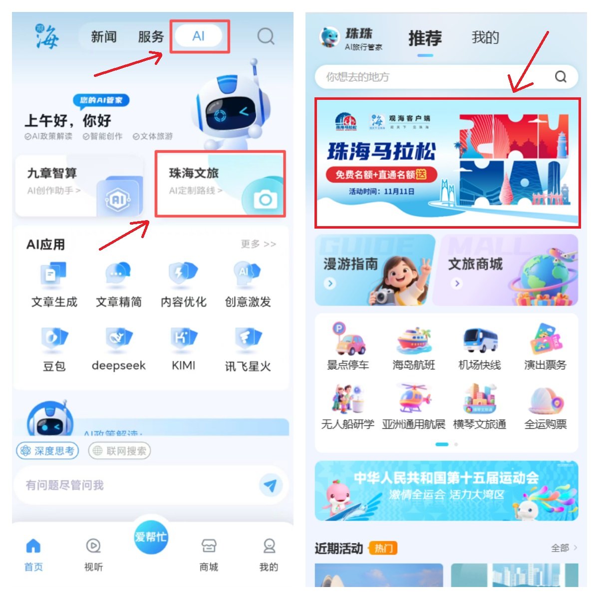 第二步:打开首页点击浮窗进入活动页面,或者点击顶部AI-点击珠海文旅-点击首页banner进入抽奖页面即可参与抽奖。