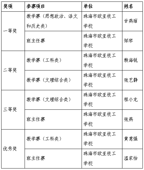 近日,在2025年珠海市技工院校和职业培训学校教师职业能力大赛中,珠海高新区技工学校——珠海市欧亚技工学校的教师以优秀的专业素养和创新能力斩获2个一等奖、2个二等奖、2个三等奖及2个优秀奖的佳绩。