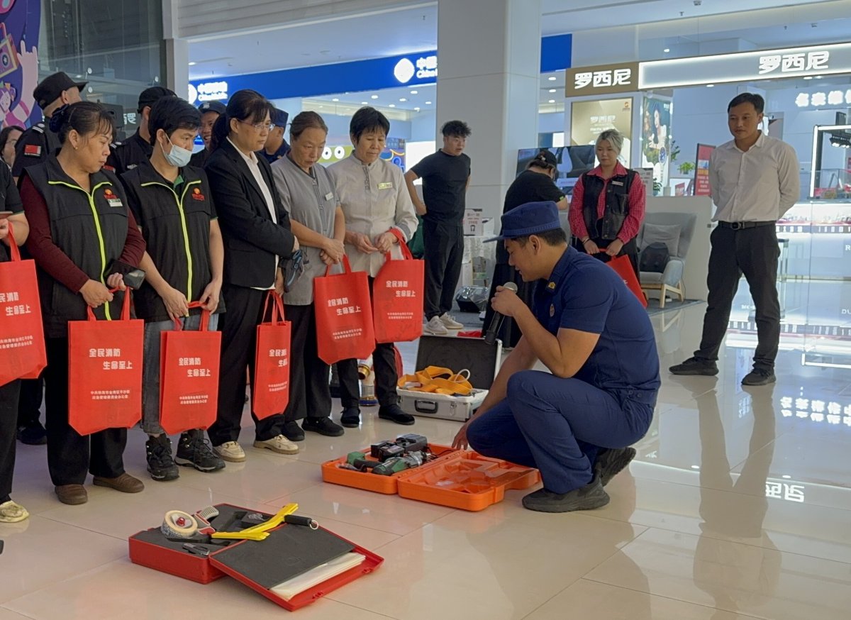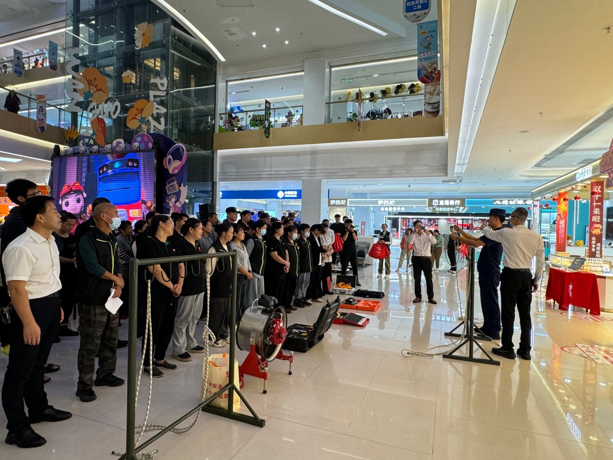 在企业培训环节,北水专职消防救援站指战员向钰海万国汇购物广场(平沙店)的店长、安保人员等企业人员以及居民群众,科普“三套腰结”的作用,并教授各种结绳的使用方法、扑救初期火灾等关键技能。