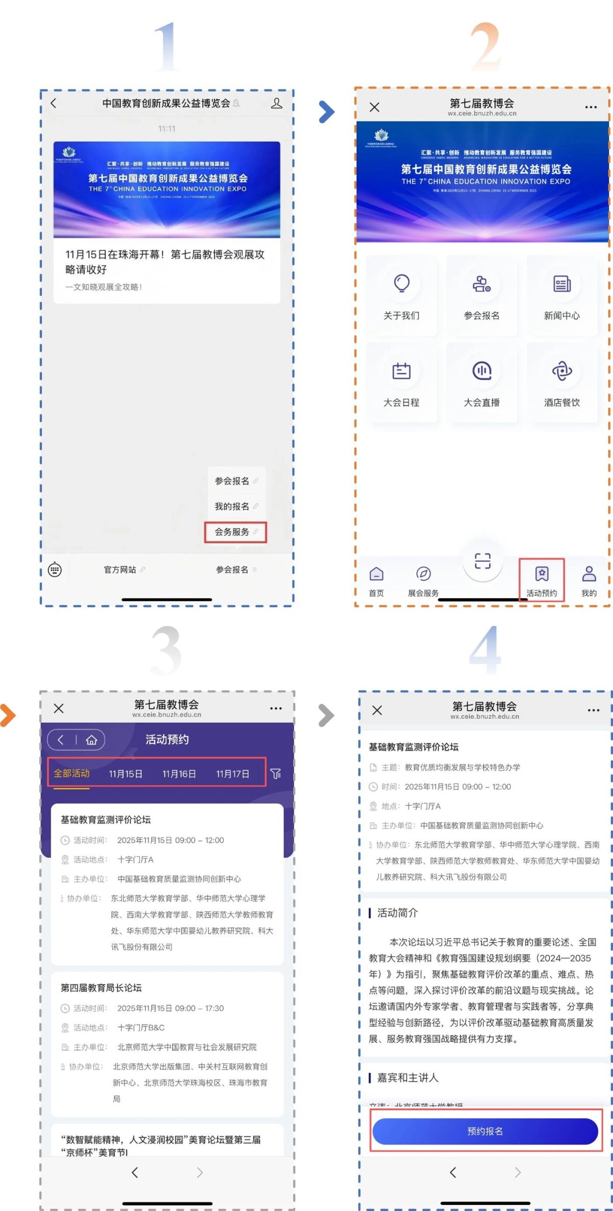 论坛活动预约现已开放!在完成大会参会报名后,参会观众可进入大会主页的“会务服务”栏目,点击页面右下角的“活动预约”。选择时间(11月15日—17日)即可看见能够预约的论坛场次,点击想参与的论坛,按照指引完成报名即可参加啦!