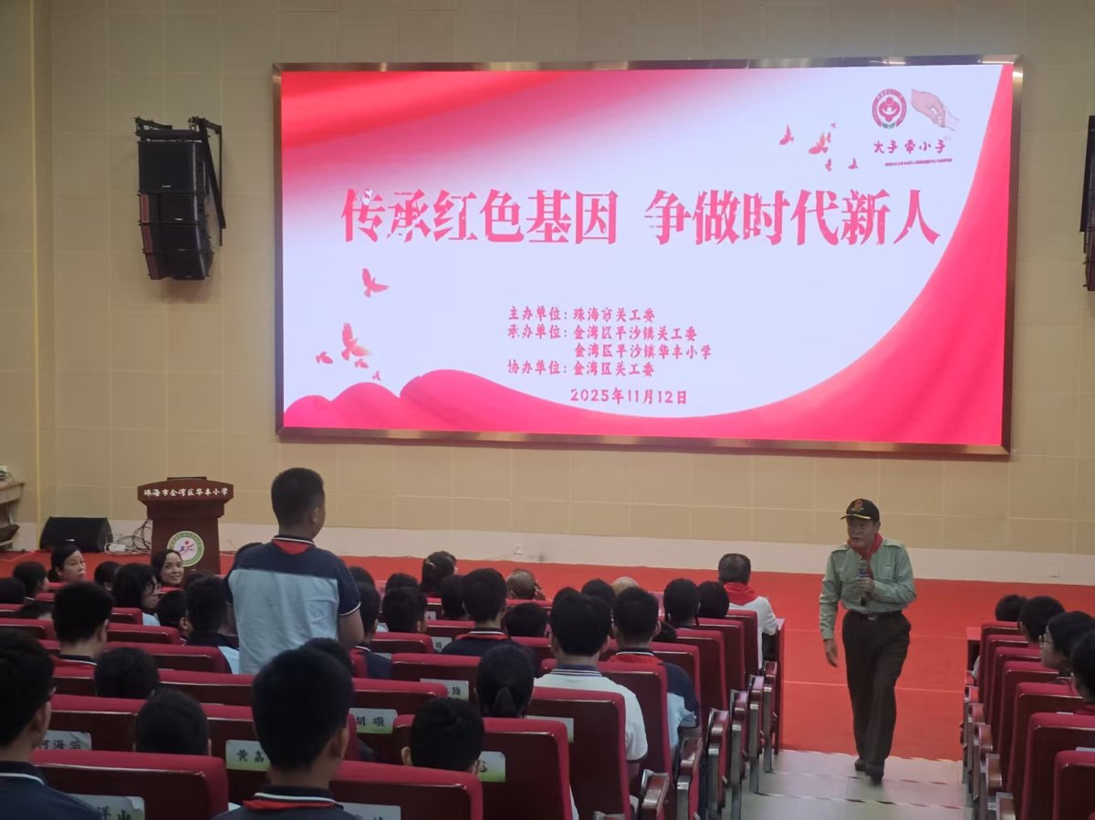 11月12日下午,金湾区平沙镇华丰小学报告厅内座无虚席,一场以“传承红色基因,争做时代新人”为主题的红色教育活动在此温情启幕。平沙镇关工委、华丰小学300多名师生共同参与,全国关心下一代工作先进工作者、珠海“皓首初心”老干部宣讲团(市关工委讲师团)讲师张洪声担任主讲。