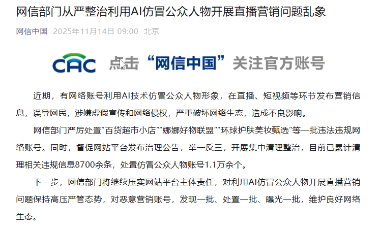 网信部门从严整治利用AI仿冒公众人物开展直播营销问题乱象