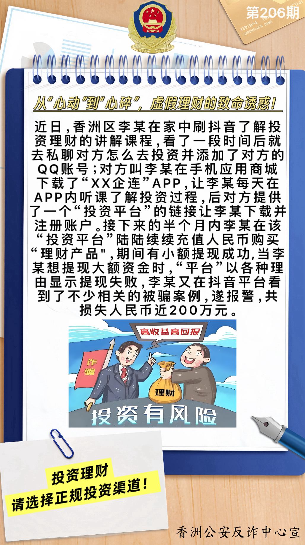 近日,珠海市公安局香洲分局反诈中心根据辖区高发类型的案件,发布了一则“每周反诈小知识”主题反诈宣传视频,内容正是虚假投资理财诈骗,并提醒群众虚假投资理财诈骗是诈骗金额最高的电诈类型之一。翠香派出所香山社区积极开展反诈宣传活动,同步将相关反诈知识通过业主群推送给辖区业主,提升居民防诈意识。