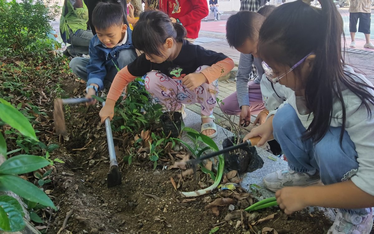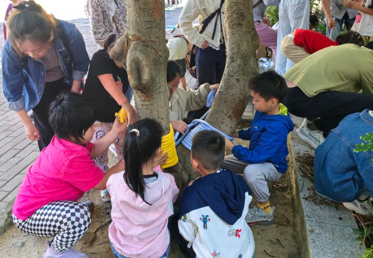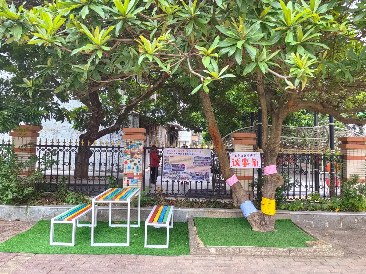 其中,“议事角”中的一棵大树是“议事树”。孩子们为树干缠绕彩色绳,悬挂“美平社区青少年议事角”牌。为助力防蚊灭蚊行动,大家还为“议事角”种植驱蚊草,用行动守护健康家园。