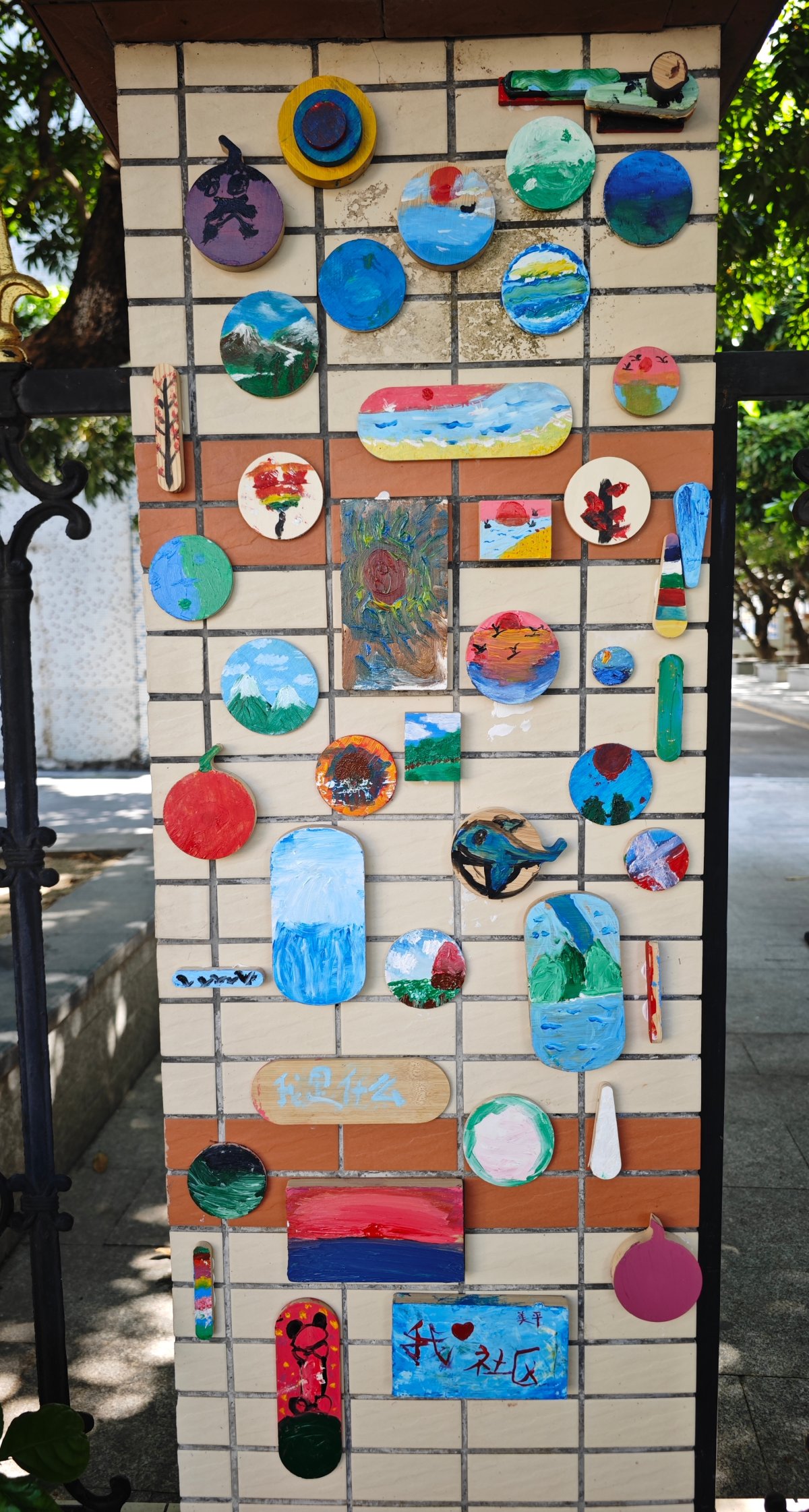 石柱上的绘画作品也均由孩子们亲手创作而成,他们以“我的理想社区”为主题,以木片为原料,以彩虹、自然美景、宠物等入画,绘制出一幅幅可爱生动的木片画,点亮社区一角。