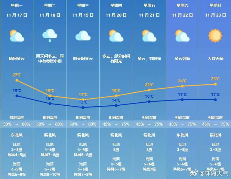 珠海七天天气预报:预计17日白天珠海市晴间多云,明天晚间起受强冷空气影响,气温显著下降,最低气温降至13℃左右,北风加大,天气阴冷;展望21-22日阳光增多,气温逐渐回升。